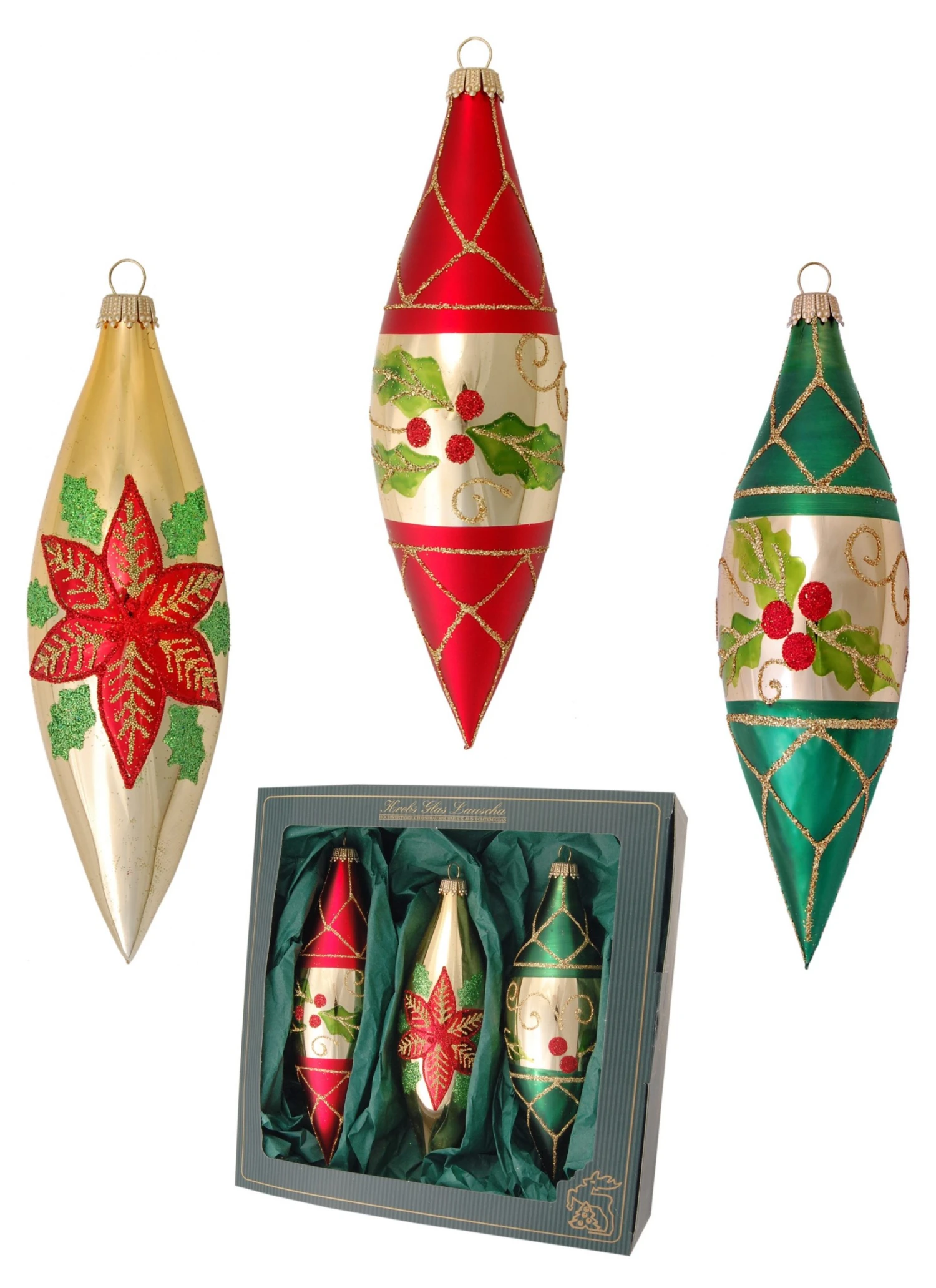 - Lieferumfang: Rot, Gold, Grün seidenmatt 15cm Olivensortiment aus Glas, 3-teilig, mundgeblasen und handdekoriert