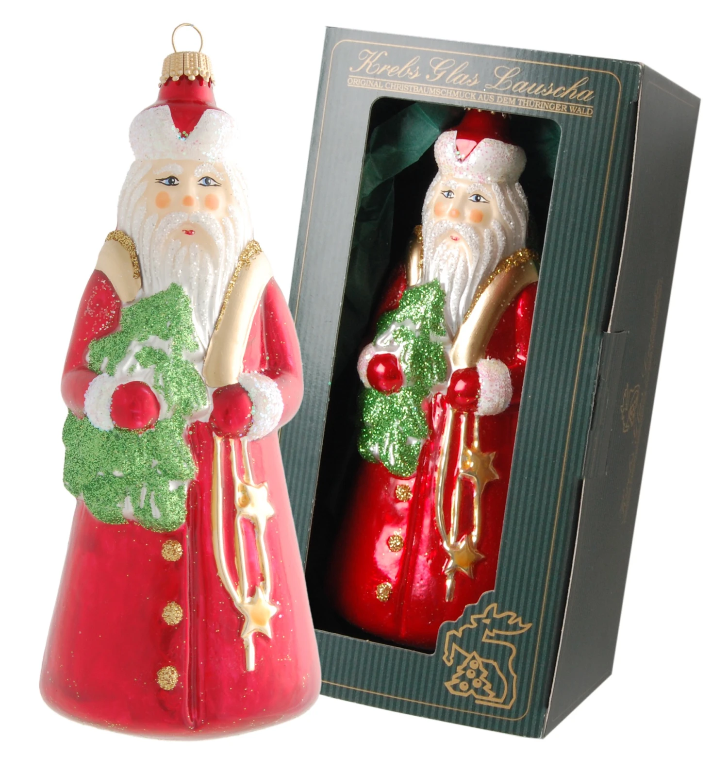 - Lieferumfang: Rot/Grün 15cm Santa mit Baum, Glasornament, mundgeblasen, handbemalt