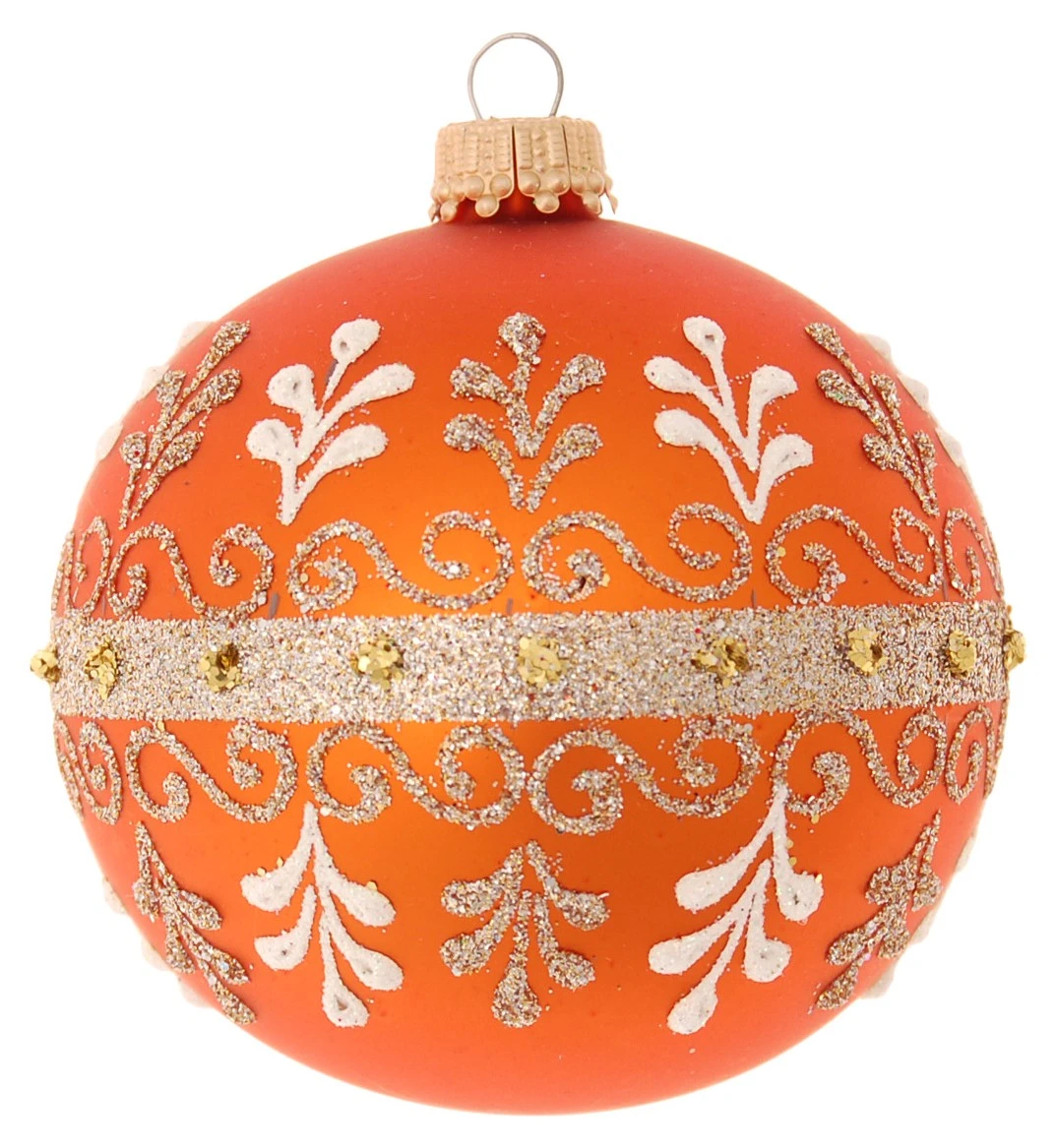 - Lieferumfang: Safran matt 8cm Glaskugel mundgeblasen und handdekoriert mit Blätterranke gold/weiß (6 Stück)