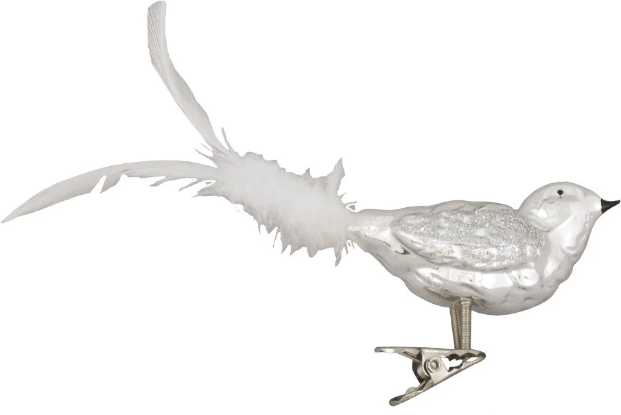 - Lieferumfang: Silber glanz 11cm Glasvogel auf Clip mundgeblasen, handdekoriert mit weißem 6cm Federschwanz