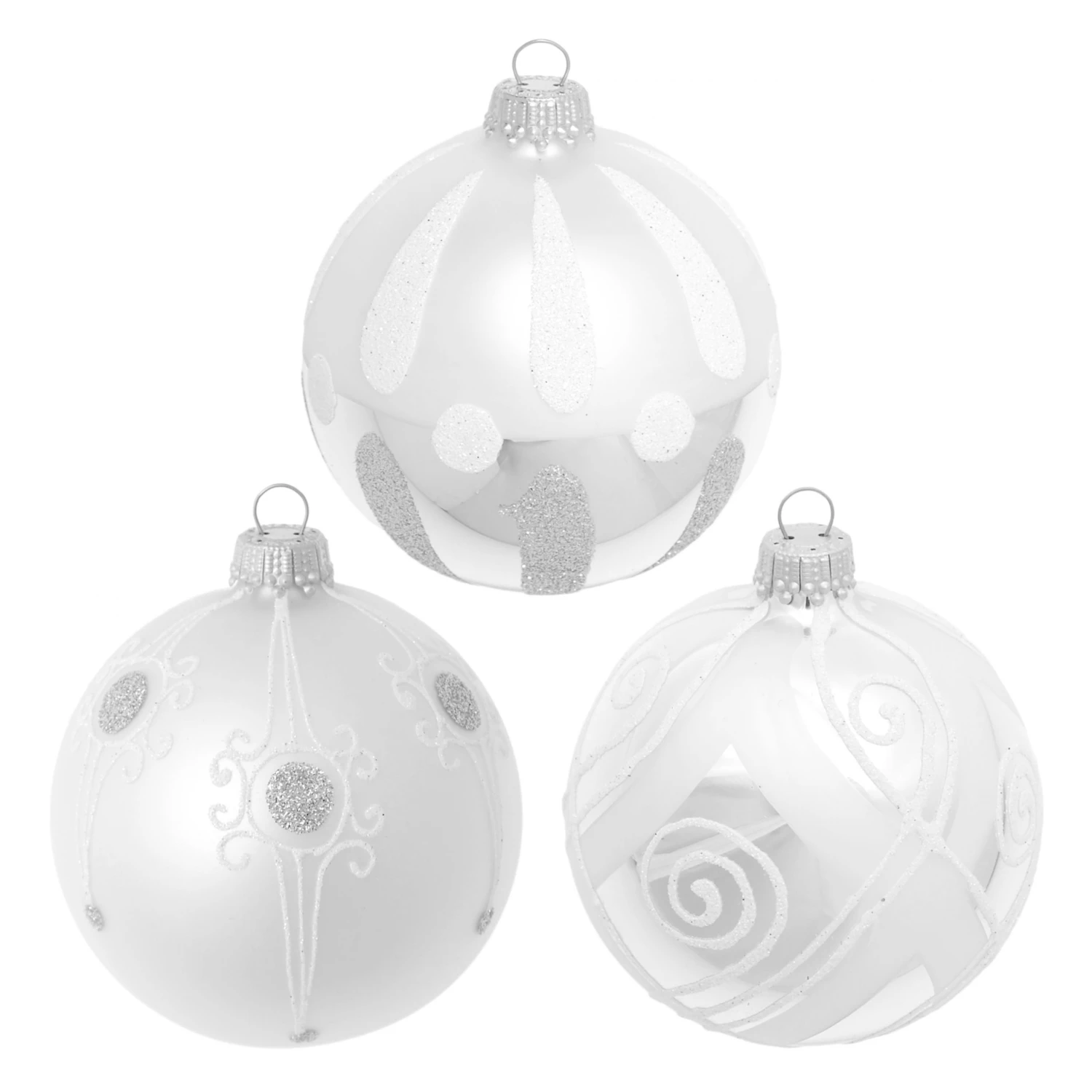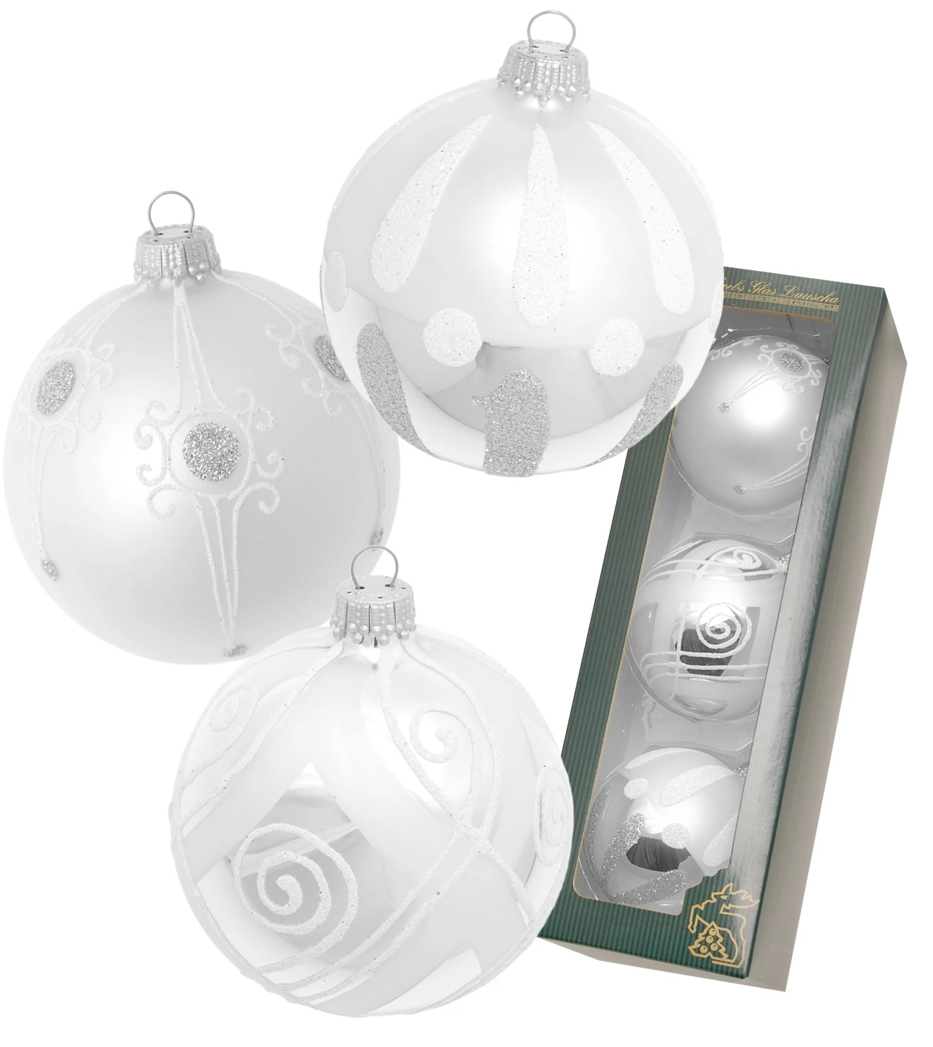 - Lieferumfang: Silber glanz/matt 8cm Glaskugelsortiment 3-fach, mundgeblasen, handbemalt