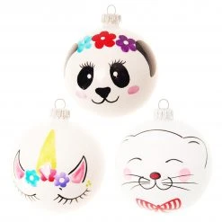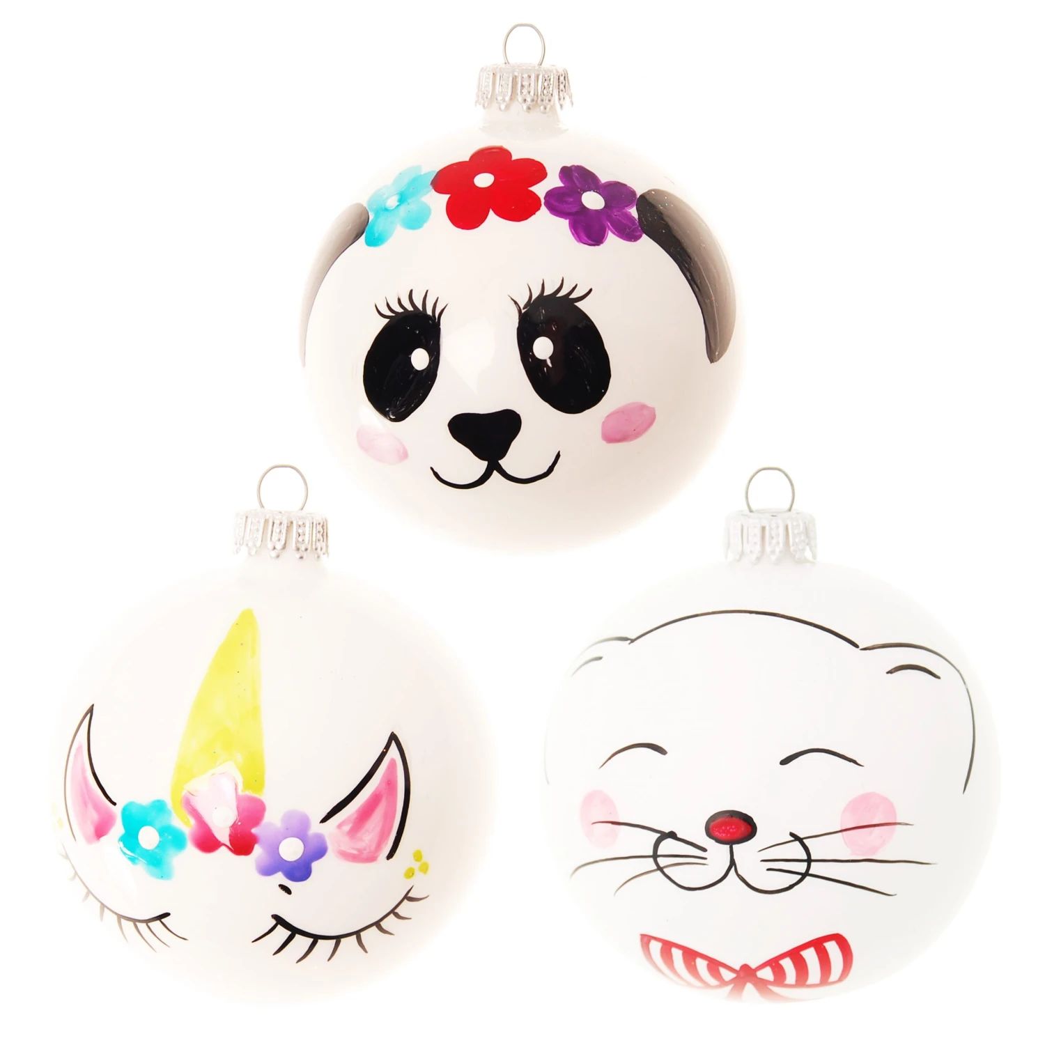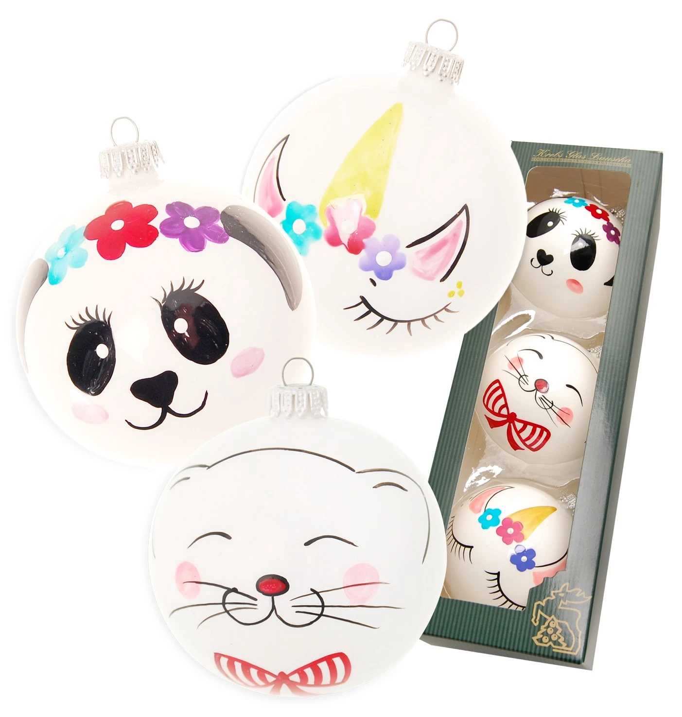 - Lieferumfang: Weiß glanz 8cm Glaskugelsortiment 3-fach, mundgeblasen, handbemalt