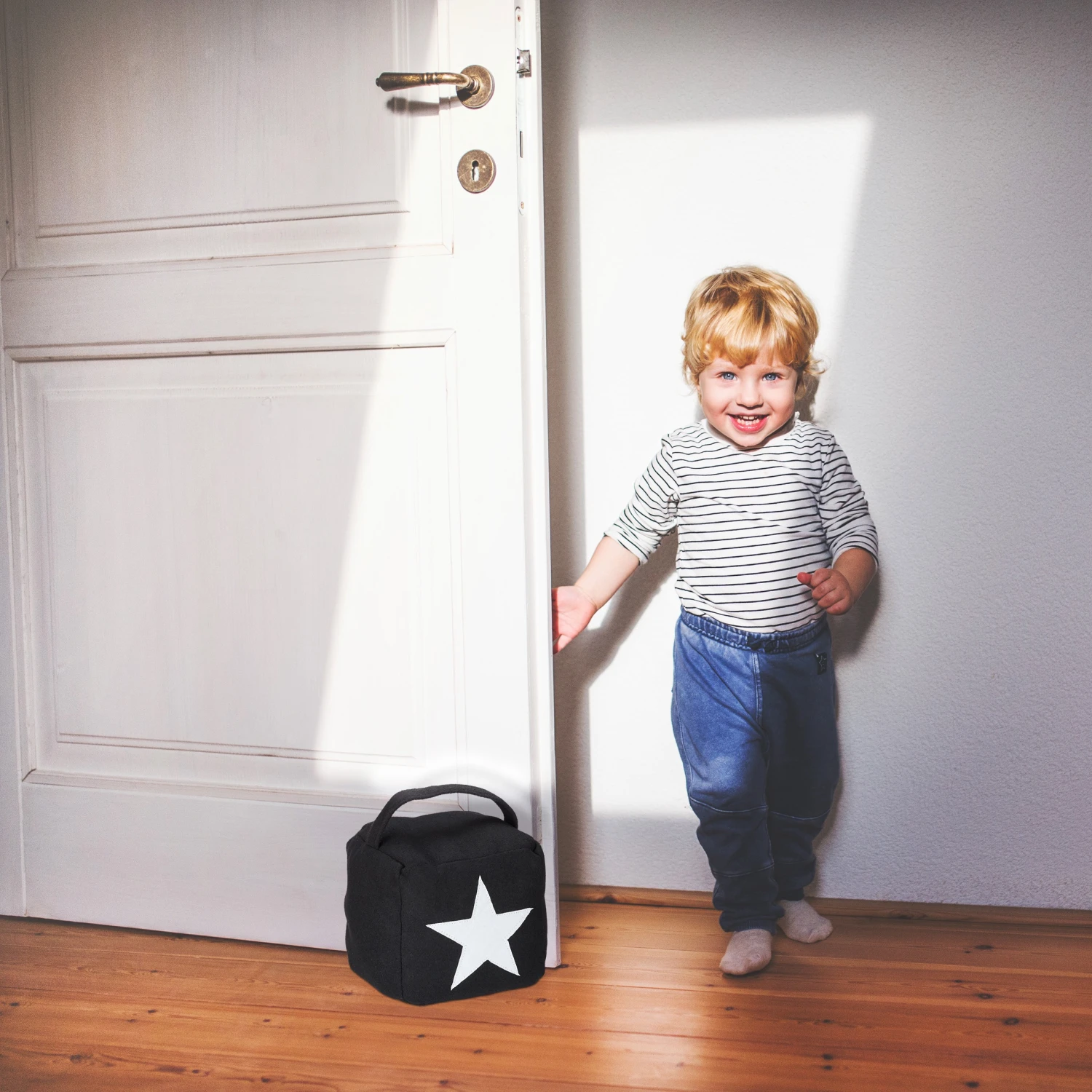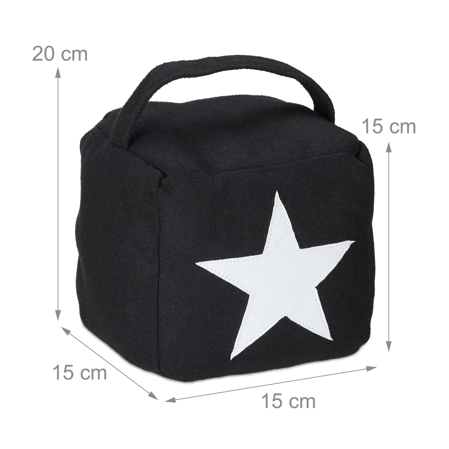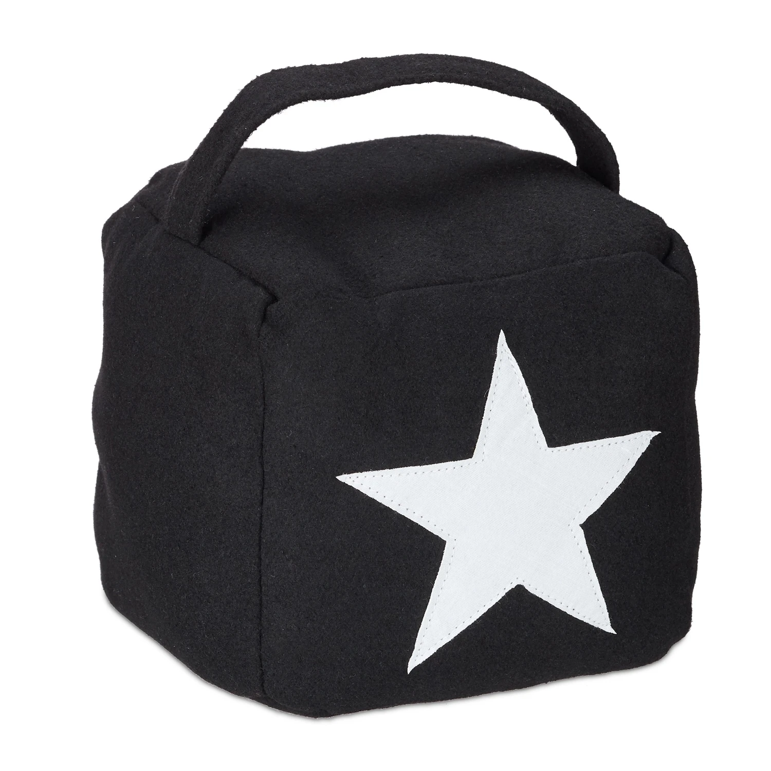 Der quadratische Türstopper aus Stoff überzeugt durch sein modernes Design mit einem dekorativen Stern auf der Vorderseite. Der Türpuffer muss nicht am Boden oder der Wand befestigt werden und kann durch den praktischen Griff einfach angehoben und jederzeit flexibel neu platziert werden.