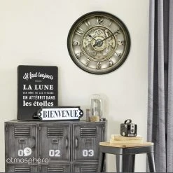 Die Uhr verfügt über einen robusten Metallrahmen und ist daher sehr langlebig. Mit qualitativ hochwertigen Quarzwerken ausgestattet, wird diese Uhr stets die Uhrzeit mit höchster Genauigkeit anzeigen. Die römischen Ziffern unterstreichen den Vintage-Stil der Uhr. Sie kann zudem leicht an die Wand gehängt werden. Diese Uhr wird Ihrem Interieur einen sauberen und ordentlichen Look verleihen.